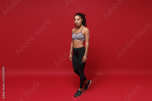 Fototapeta premium Beautiful young african american sports fitness woman in sportswear posing working out isolated on bright red background studio portrait. Sport exercises healthy lifestyle concept. Looking camera.