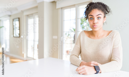 © Krakenimages.com, Obraz premium Beautiful young african american woman with afro hair sitting on table at home puffing cheeks with funny face. Mouth inflated with air, crazy expression.