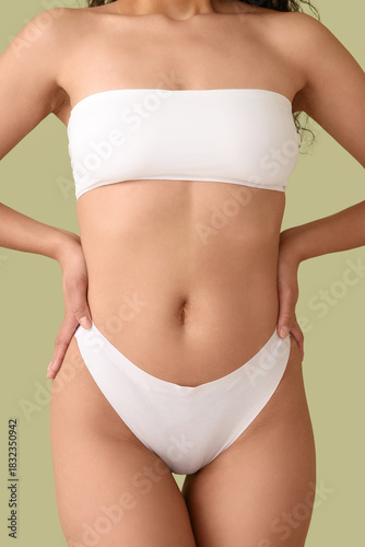 Fototapeta premium Beautiful young African-American woman with stretch marks on her body against green background, closeup