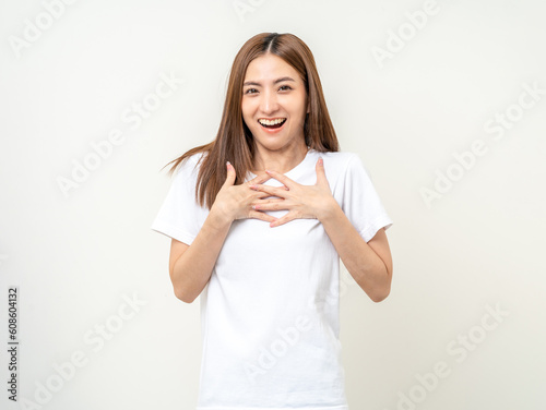 © Chanakon, Fototapeta premium Beautiful young asian woman age around 25 smiling. Charming female standing on isolated background. People pose Excited shocked face asian woman shout out loud wow Joyful winning victory challenge