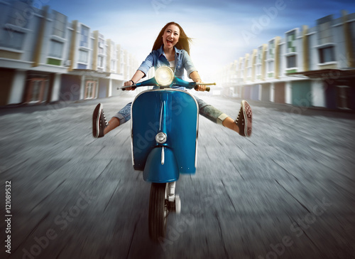 © Leo Lintang, Naklejka premium Beautiful young asian woman riding a motorcycle