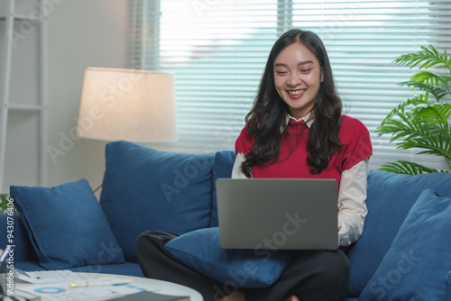 © crizzystudio, Naklejka premium Beautiful young Asian woman sitting on sofa using laptop and calculator for homework, online work, learning, studying, thinking. Working concept startup business.