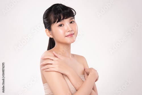 © kitthanes , Obraz premium Beautiful Young Asian Woman touching her body with fresh Healthy Skin, isolated on white background, Beauty Cosmetics and Facial treatment Concept.