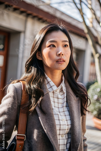 Fototapeta premium Beautiful young Asian woman walking with a straight back, head held high, and a determined look, expressing confidence