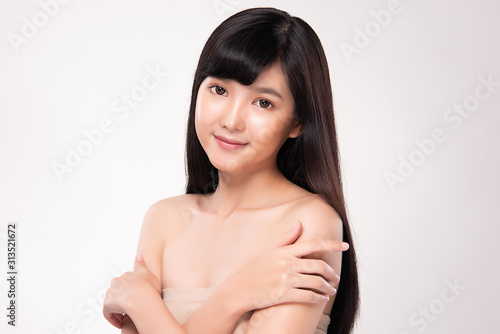 Obraz premium Beautiful Young Asian Woman with Clean Fresh Skin. Face care, Facial treatment, on white background, Beauty and Cosmetics Concept.