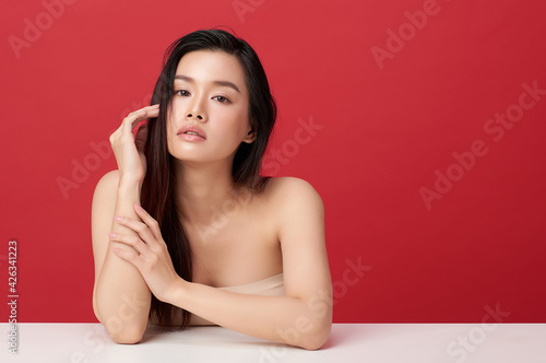 © kitthanes , Fototapeta premium Beautiful young asian woman with clean fresh skin on red background, Face care, Facial treatment, Cosmetology, beauty and spa, Asian women portrait