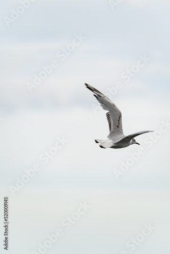 Obraz premium beautiful young black-headed gull flies with its wings spread wide against sky
