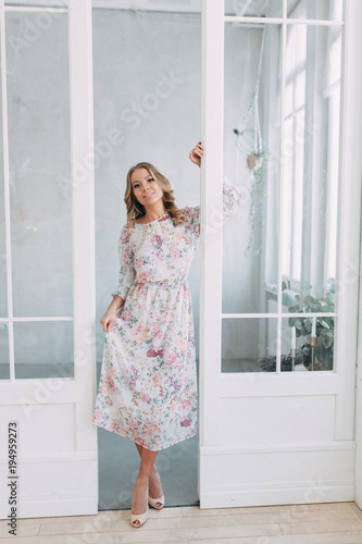 © pavelvozmischev, Fototapeta premium beautiful young blonde woman in nice spring dress, elegant black sunglasses posing in a studio. Fashion spring summer photo