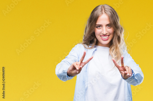 Fototapeta premium Beautiful young blonde woman over isolated background smiling looking to the camera showing fingers doing victory sign. Number two.