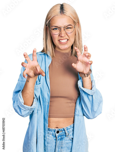 Obraz premium Beautiful young blonde woman wearing glasses smiling funny doing claw gesture as cat, aggressive and sexy expression