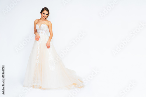 Fototapeta premium beautiful young bride in a wedding dress demonstrates different poses