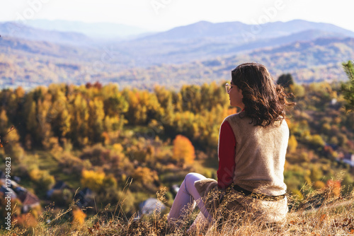 © czamfir, Naklejka premium Beautiful young brunette enjoys a sunny day of autumn in nature
