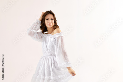 © Rychko Yevhen, Fototapeta premium beautiful young brunette woman in white dress