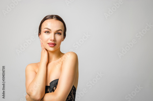 Fototapeta premium Beautiful young brunette woman with perfect skin at gray background. Skin and facial care. Cosmetology and beauty