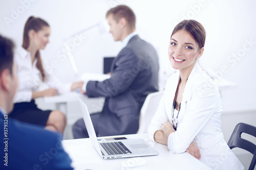 © lenets_tan, Obraz premium Beautiful young business people with colleagues discussing in