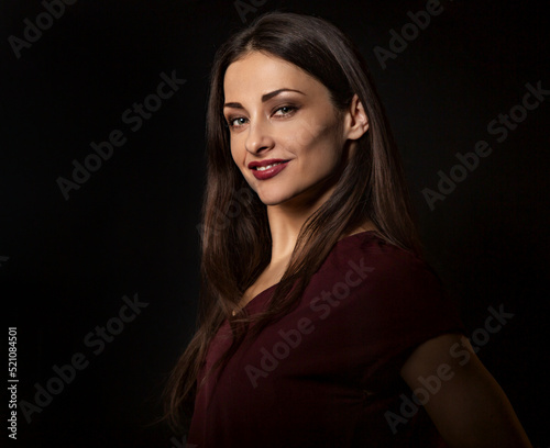 © Anastasia.photoyoga, Fototapeta premium Beautiful young business toothy smiling woman thinking and looking happy in burgundy blouse and with red lipstick on dark shadow black background with empty copy space. Portrait