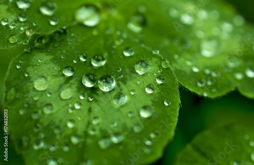 © a_darya, Fototapeta premium Beautiful young carved clover leaf covered with fine dew drops in a beautiful sun: interesting point of view dark edition