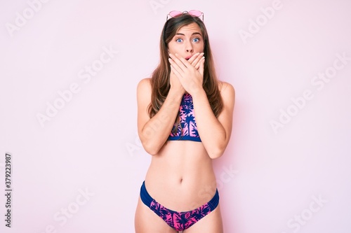 © Krakenimages.com, Naklejka premium Beautiful young caucasian woman wearing bikini and sunglasses shocked covering mouth with hands for mistake. secret concept.