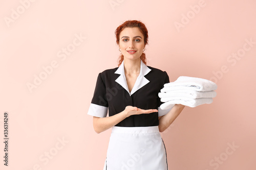 © Pixel-Shot, Fototapeta premium Beautiful young chambermaid with towels on color background
