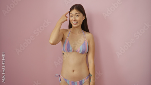 © Krakenimages.com, Naklejka premium Beautiful young chinese woman in a colorful bikini poses against a pink wall isolated background, smiling attractively while pointing to her head