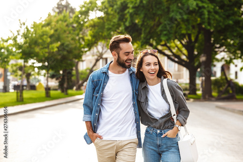 Naklejka premium Beautiful young couple in love walking outdoors at the city street