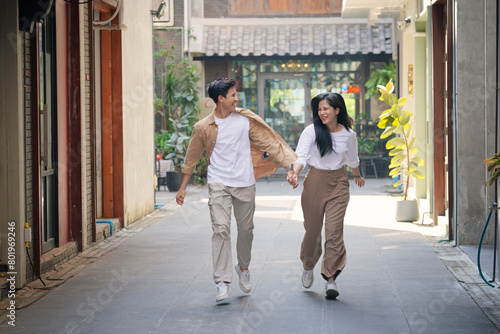 Naklejka premium Beautiful young couple outdoors in the park. Portraits of lovers. Autumn. Spring. Holiday Valentine's Day.