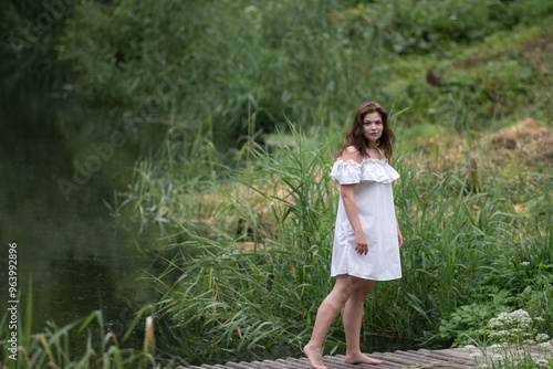 Naklejka premium Beautiful young dark-haired girl by the river.