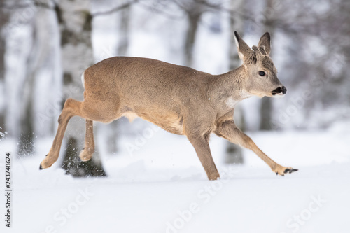 © janstria, Fototapeta premium Beautiful young deer on a winter day. Everything covered in fresh white snow, more falling down. Cute cub in nature. Meadow, forest, typical animal.