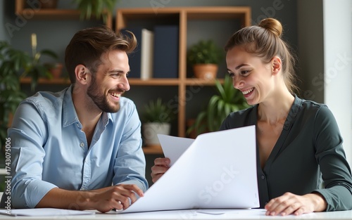 © happy, Fototapeta premium Beautiful young designers discussing ideas and smiling while working in office. High quality
