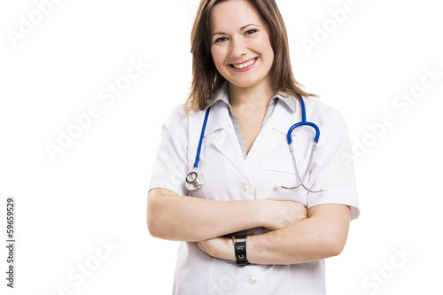 Fototapeta premium Beautiful young doctor, isolated over white background
