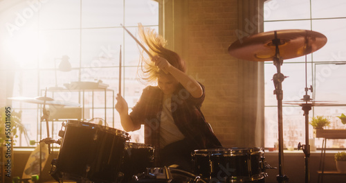 © Gorodenkoff, Fototapeta premium Beautiful Young Drummer Playing at a Band Rehearsal, Doing Tricks with Drumsticks. Learning Drum Solo on Drums and Cymbals in Sunny Living Room Loft Apartment. Portrait of Attractive Musician.