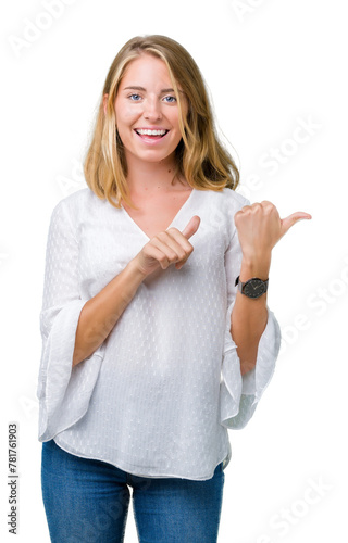 © Krakenimages.com, Obraz premium Beautiful young elegant woman over isolated background Pointing to the back behind with hand and thumbs up, smiling confident