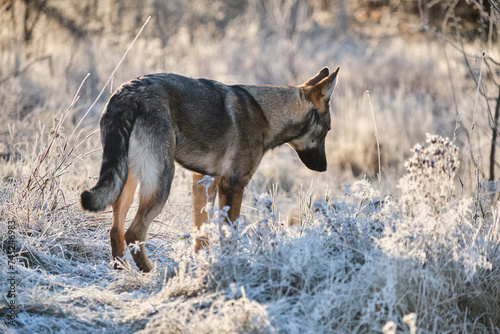 Fototapeta premium Beautiful young German Shepherd female dog in a meadow in winter on a sunny...