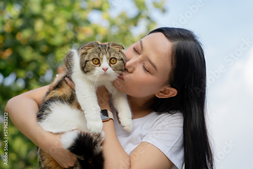 Obraz premium Beautiful young girl holds a Scottish cat with orange eyes, outdoor, close-up