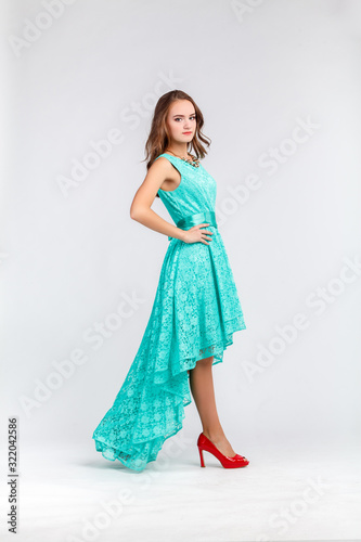 © PakoStudio, Fototapeta premium Beautiful young girl in long evening turquoise dress, goes in full length, motion, gait, guipure dress with plume, isolated on white background. Looks at the camera. Photo from the series