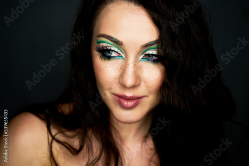 Fototapeta premium Beautiful young girl in the studio . The face of a young beautiful girl with a bright green make-up. Fashion, beauty, make-up, cosmetics, hairstyle, beauty salon, boutique, discounts, sales.