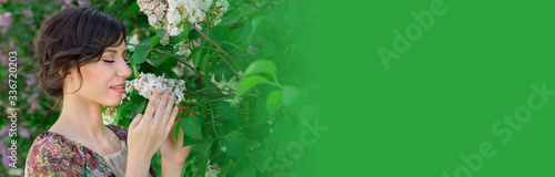 © q12m, Fototapeta premium Beautiful young girl is surrounded by flowers of Lilac. Cosmetic products for skin care. Health, beauty, cosmetics concept banner