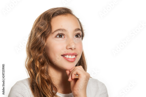 © anamejia18, Fototapeta premium Beautiful young girl thinking or having an idea isolated on white background