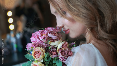 Naklejka premium Beautiful young girl with a bouquet of flowers