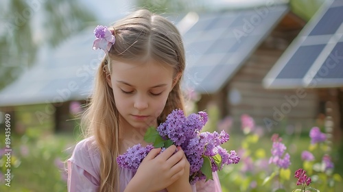 © Generative AI, Fototapeta premium Beautiful young girl with purple lilacs flower in hands Young girl spending time outdoors in nature springtime House with solar panels in background : Generative AI