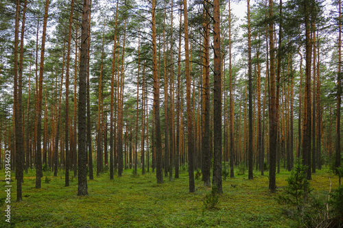 © Dzmitry, Fototapeta premium Beautiful young green spruce forest in spring.
