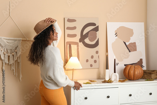 Obraz premium Beautiful young happy African-American woman in stylish outfit with autumn leaves, pumpkin and hat at home