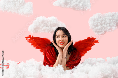 Fototapeta premium Beautiful young happy woman dressed as cupid lying in clouds on pink...
