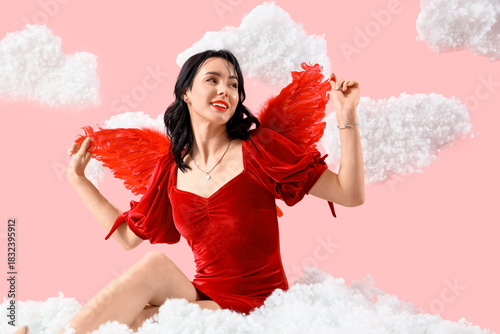 © Pixel-Shot, Obraz premium Beautiful young happy woman dressed as cupid sitting in clouds on pink background. Valentine's Day celebration