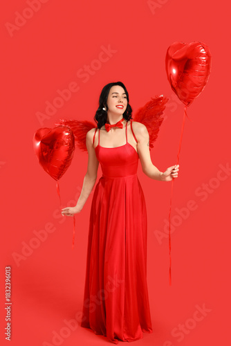 Fototapeta premium Beautiful young happy woman dressed as cupid with heart-shaped balloons on red background. Valentine's Day celebration