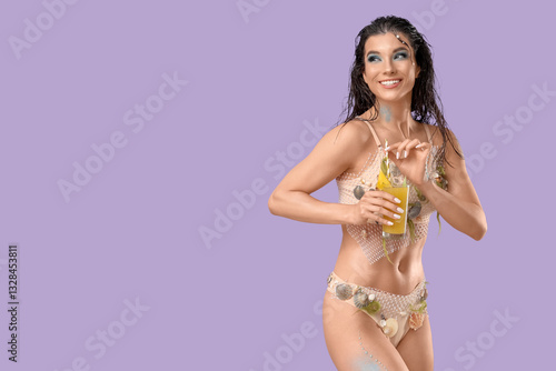 Fototapeta premium Beautiful young happy woman dressed as mythical mermaid with glass of pineapple juice on purple background
