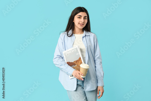 Fototapeta premium Beautiful young happy woman with magazine and cup of coffee on blue background