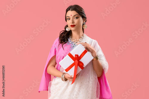 Fototapeta premium Beautiful young Indian woman in sari with gift box on pink background