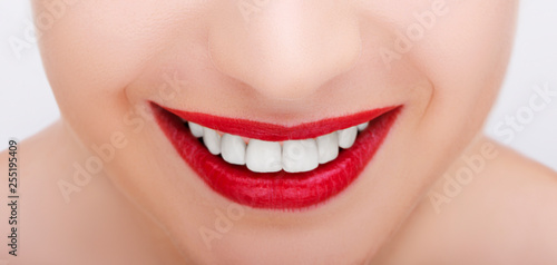 © Victoria Key, Obraz premium Beautiful young model red lips. Part of a beautiful face
