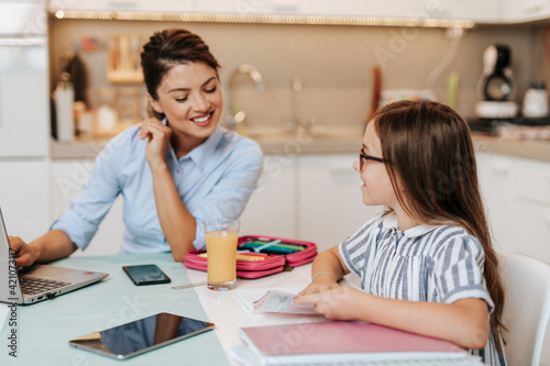Obraz premium Beautiful young mother helping her younger daughter with homework.